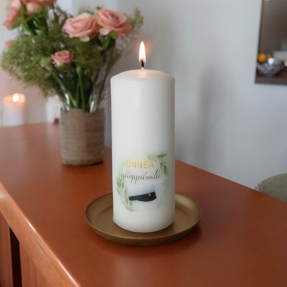 Onnittele ylioppilasta tällä ihastuttavalla onnittelukynttilällä! Siirtokuvatekniikalla koristetussa kynttilässä on ylioppilaslakki herkän, vihreän kranssin keskellä, sekä teksti "Onnea ylioppilaalle!".