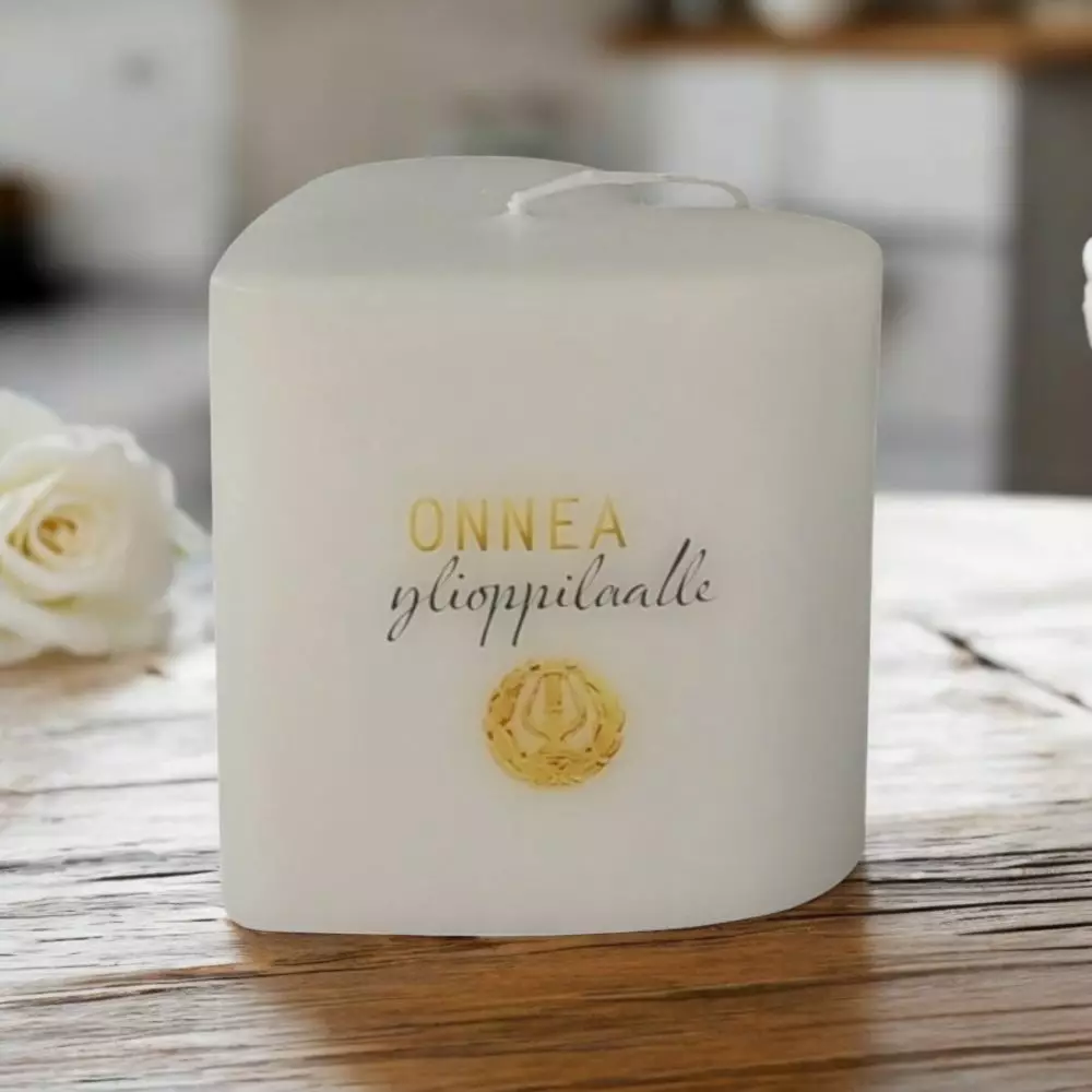 Tätä sydänkynttilää koristaa kaunis ylioppilaslyyran kuva, jossa lukee: "Onnea ylioppilaalle!"