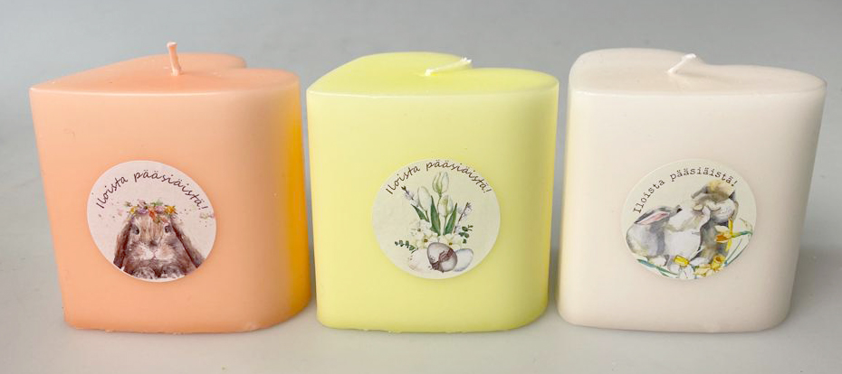 Aprikoosin värisessä sydänkynttilässä on pupun kuva ja tarrassa lukee "Iloista pääsiäistä!" Vaaleankeltaisessa sydänkynttilässä on tulppaaneita ja pajukissoja ja tarrassa lukee "Iloista pääsiäistä!" Aprikoosin värisessä sydänkynttilässä on kaksi pupua ja narsisseja sekä tarrassa lukee "Iloista pääsiäistä!"