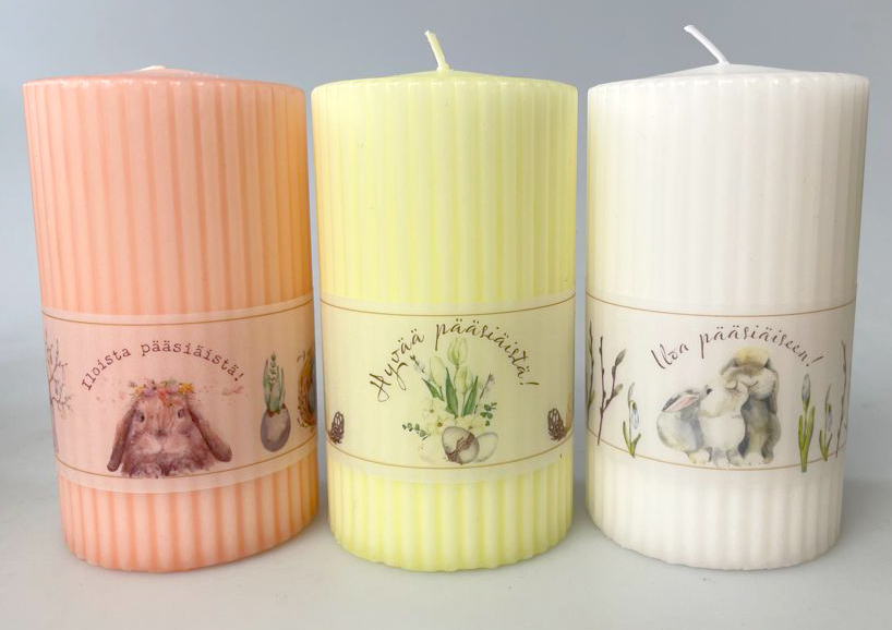 Vekkikynttilöitä somistavat herkät vyötteet, joihin on painettu pääsiäisen teemaan liittyvää kuvitusta. Kynttilät ilahduttavat viehkeillä pastellisävyillään.