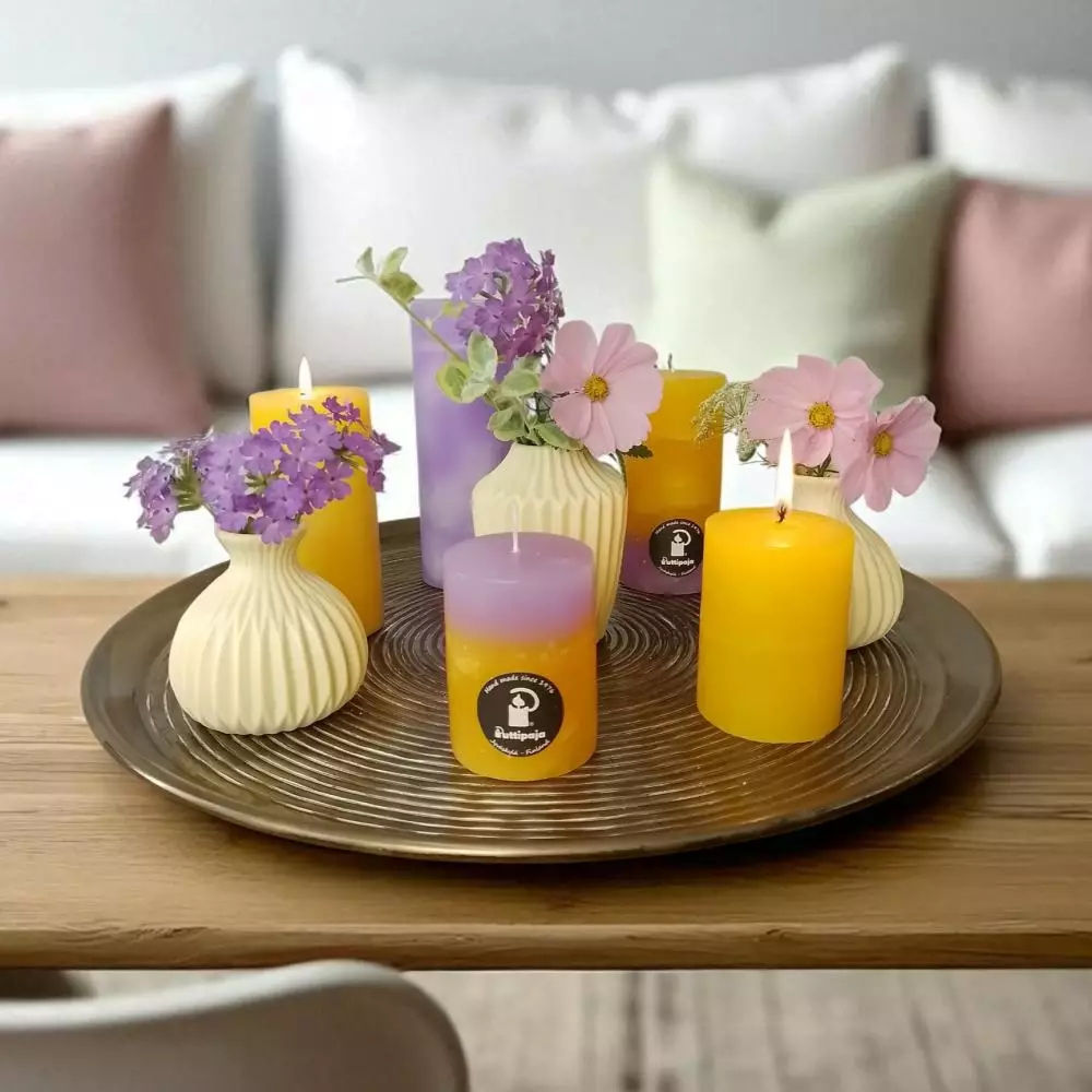 Keltaisen jalallisen pallokynttilän paloaika on 12 tuntia. Pallokynttilät myydään kahden kynttilän paketissa.