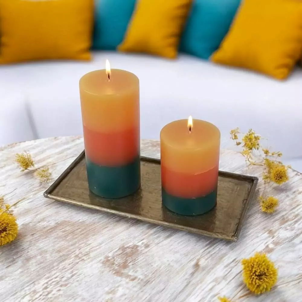 Läpivärjätty pöytäkynttilä Väri: okra, terra, petrooli Koostumus: 100% parafiinia Kynttilän paloaika: 7x10 cm ~45 h 7x15 cm ~75 h