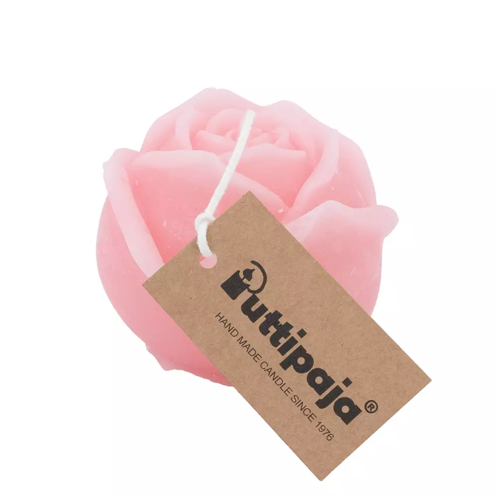 Puttipajan läpivärjätty käsinvalettu vaaleanpunainen pöytäkynttilä.