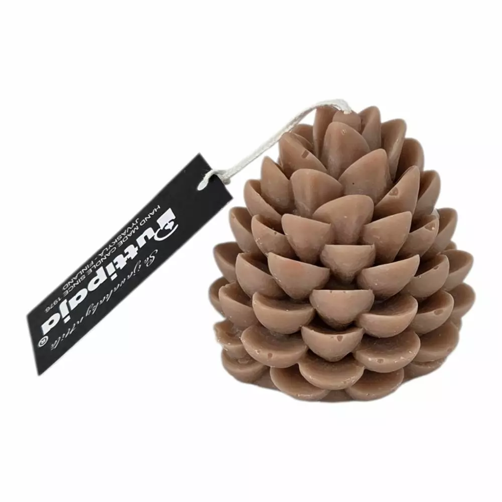 Luonnonläheinen kaakakon sävyinen käpykynttilä tuo lämpöä ja harmoniaa joulun sisustukseen.