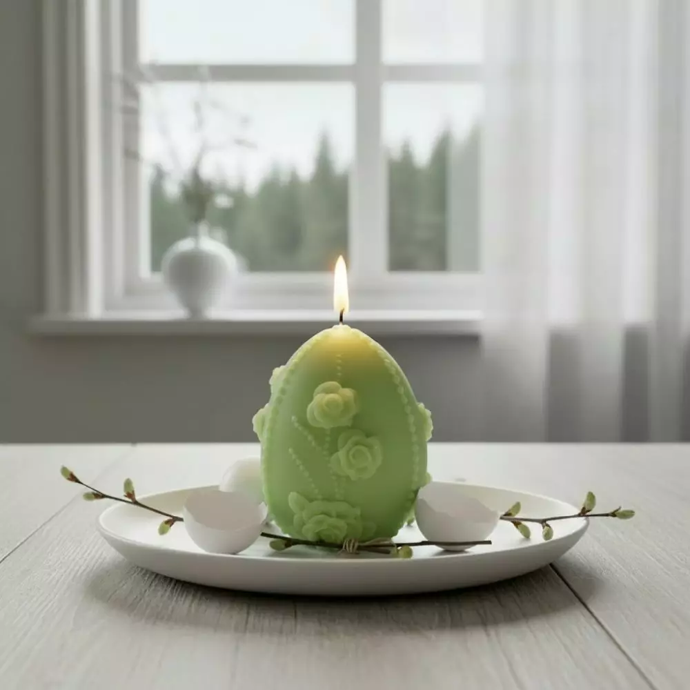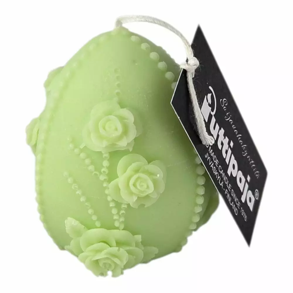 Kynttilän koristeellinen munamuoto ja ruusukuviointi tekevät siitä näyttävän sisustuselementin, ihastuttavan pääsiäistuliaisen ja täydellisen lahjan kevään juhliin.