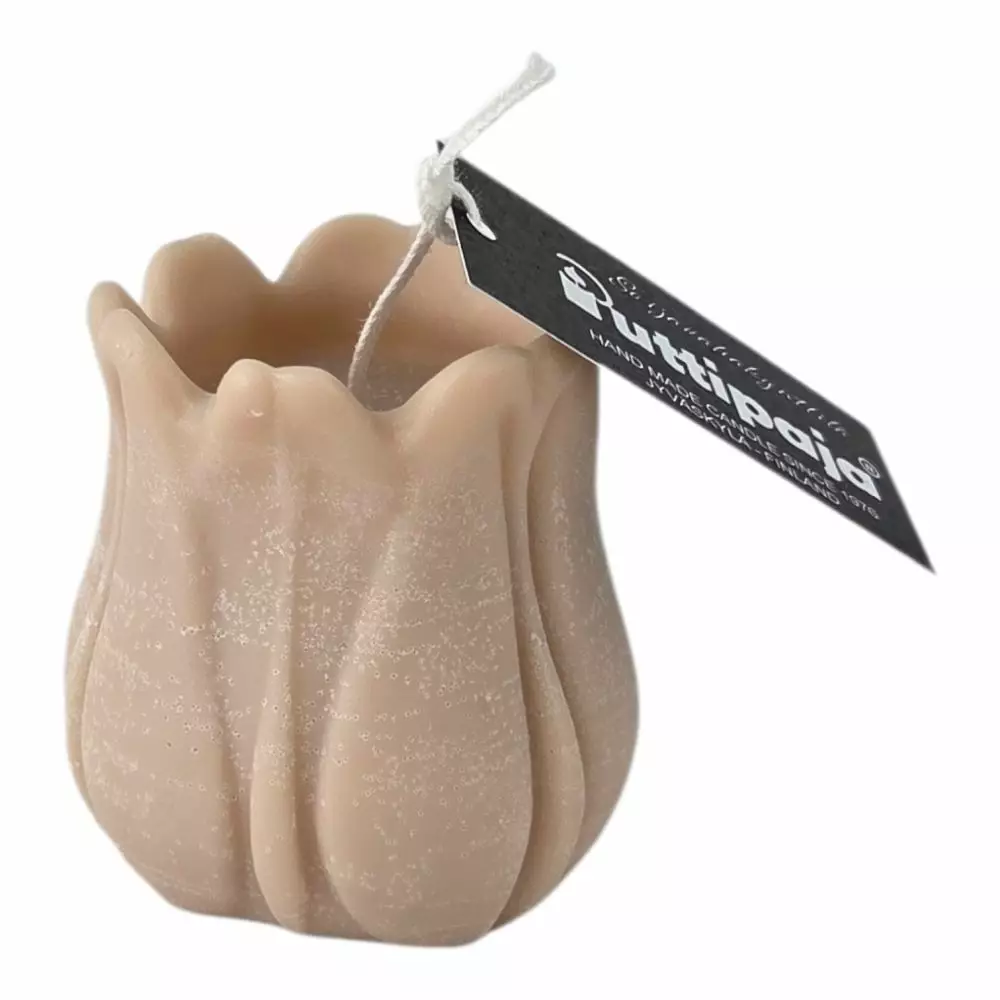 Puttipajan puuterin sävyinen tulppaanikynttilä on hurmaava yhdistelmä käsityötä, ekologisuutta ja estetiikkaa.