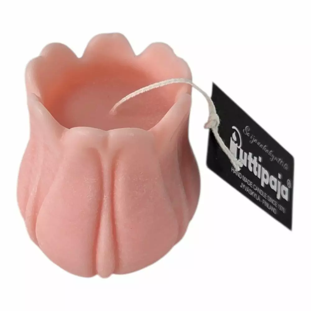 Käsintehty tulppaanikynttilä ekologisesta soijavahasta. Lehmuksen sävy tuo pehmeyttä sisustukseen ja sopii täydellisesti lahjaksi kevään juhliin. Tilaa Puttipajalta!