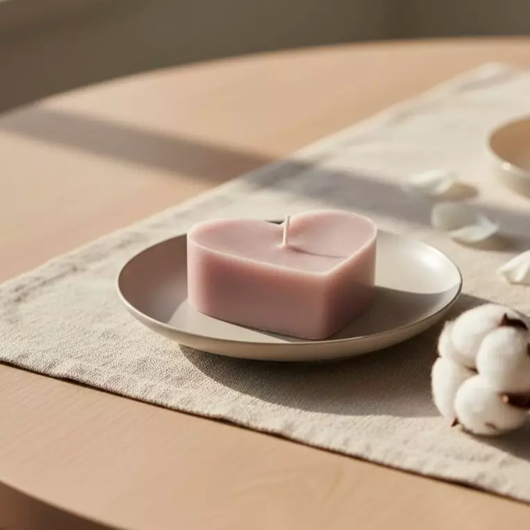 Suloinen vaaleanpunainen sydänkynttilä soijavahasta. Sopii lahjaksi, kattauksiin ja romanttisiin hetkiin. Palaa kauniisti ja luo pehmeää tunnelmaa. Koko 6,5 × 6 × 2 cm.