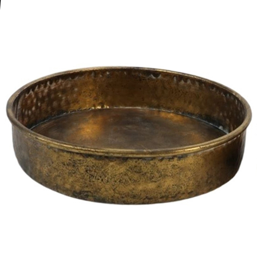 Metallinen antiikkikultaisen värinen patinoitu Tasmine-tarjotin. Tarjotin soveltuu erinomaisesti kynttilänaluseksi, tai sisustuselementiksi. Tarjotin ei kuitenkaan suositella elintarvikekäyttöön.