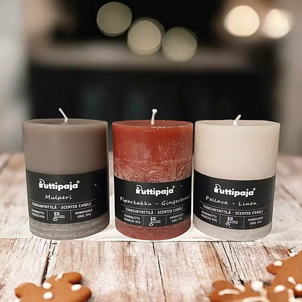 Paketin sisältämät tuoksukynttilät ovat Mulperi, Piparkakku, Pellava.