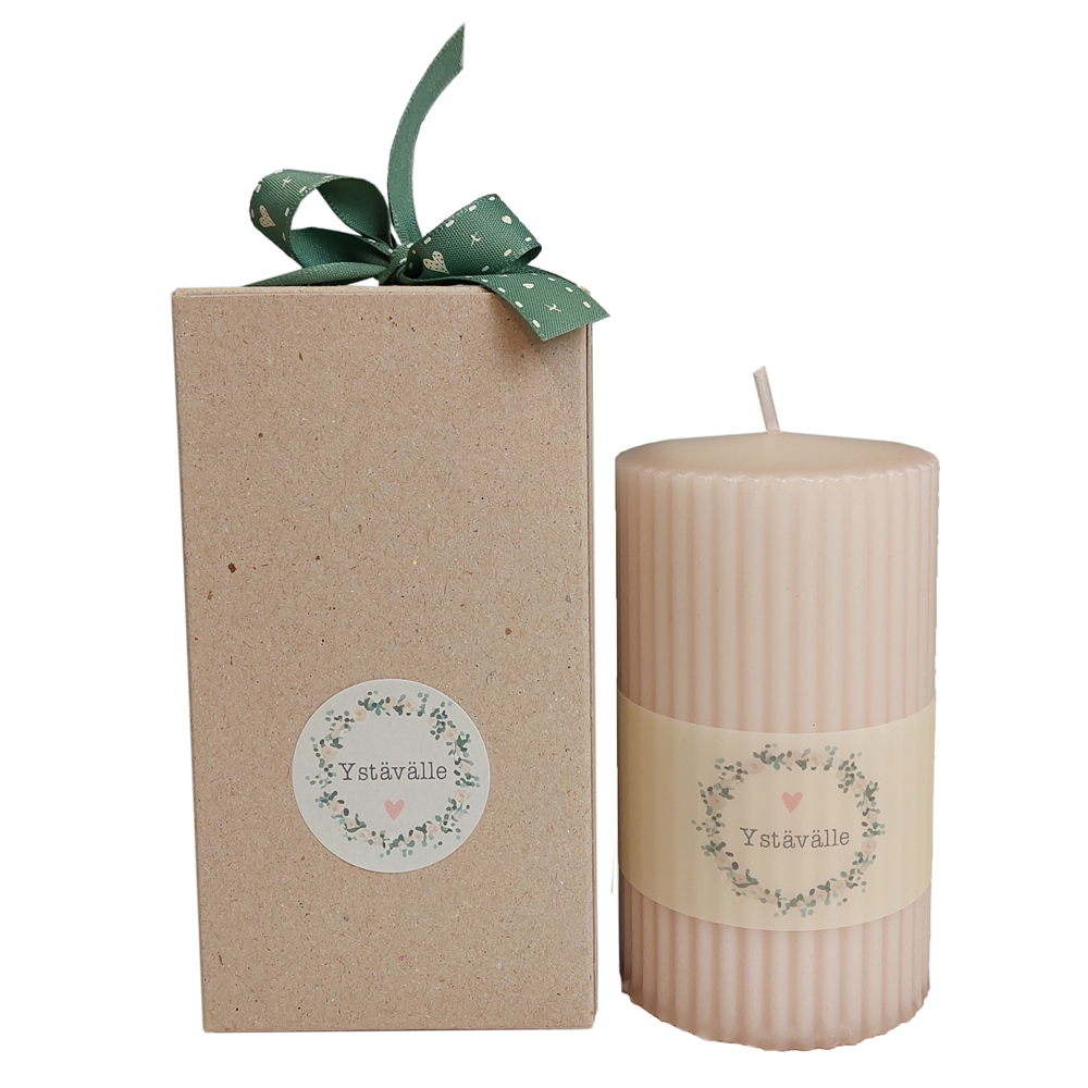 Ojenna ystävällesi kaunis paketti, jonka sisällä on kerman sävyinen vekkikynttilä.