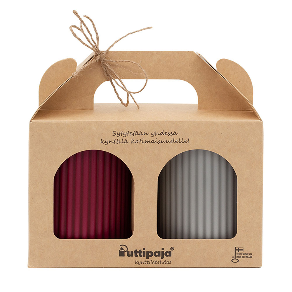 Viininpunaisen jalallisen pallokynttilän paloaika on 12 tuntia. Pallokynttilät myydään kahden kynttilän paketissa.