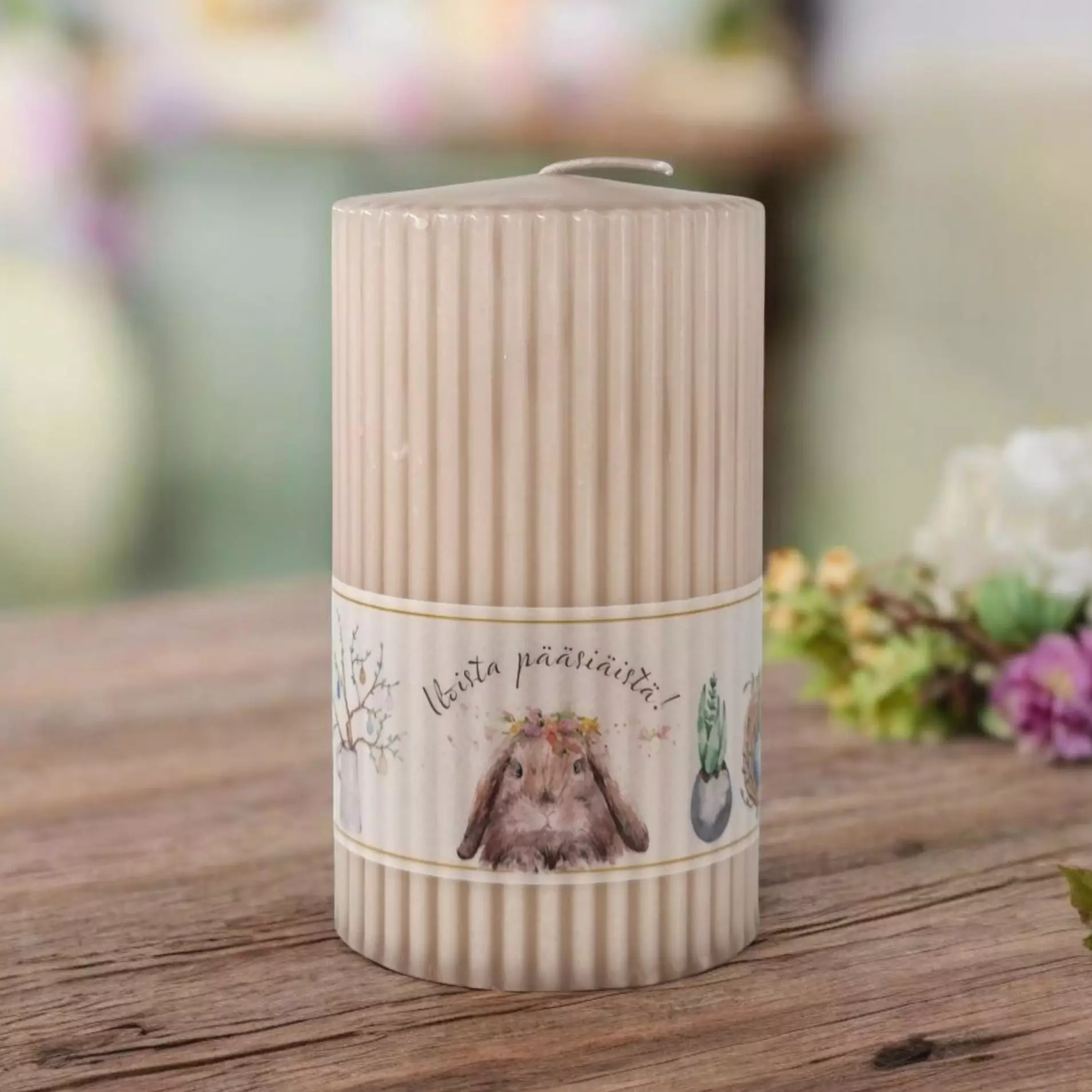 Vekkikynttilää somistaa herkkä vyöte, johon on painettu pääsiäisen teemaan liittyvää kuvitusta ja pääsiäistervehdys.