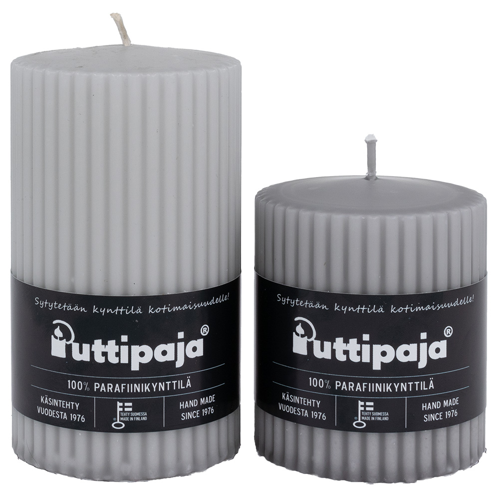 Vaaleanharmaa pintavärjätty vekkikynttilä.