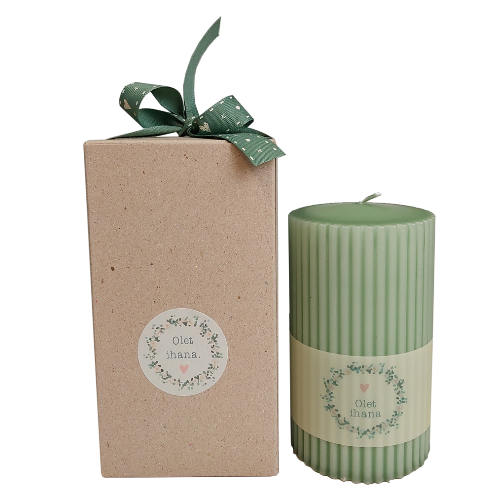 Kynttilä on kääräisty silkkipaperiin ja paketoitu kartonkipakkaukseen. Tekstiilinauha viimeistelee ihanan yllätyksen.