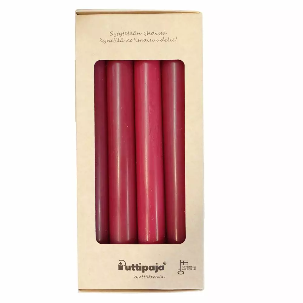 Kynttilän liekin ihastuttava hehku on täydellinen tunnelman tuoja. Läpivärjätty kynttilä säilyttää kauniin värinsä myös kynttilän palaessa. Laadukkaasta parafiinista valmistettu ja puuvillaisella sydänlangalla kruunattu läpivärjätty kruunukynttilä on käsin valettu kynttilätehtaallamme Vaajakoskella.