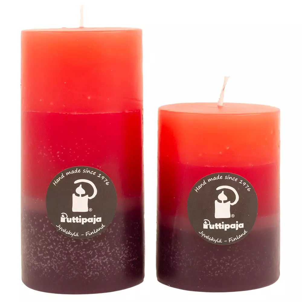 Läpivärjätty raitakynttilä säilyttää kauniin värinsä myös kynttilän palaessa. Puttipajan pöytäkynttilän pintakuviointi on vivahteikkaan eläväinen, jota kynttilän liekin valo korostaa kauniisti.