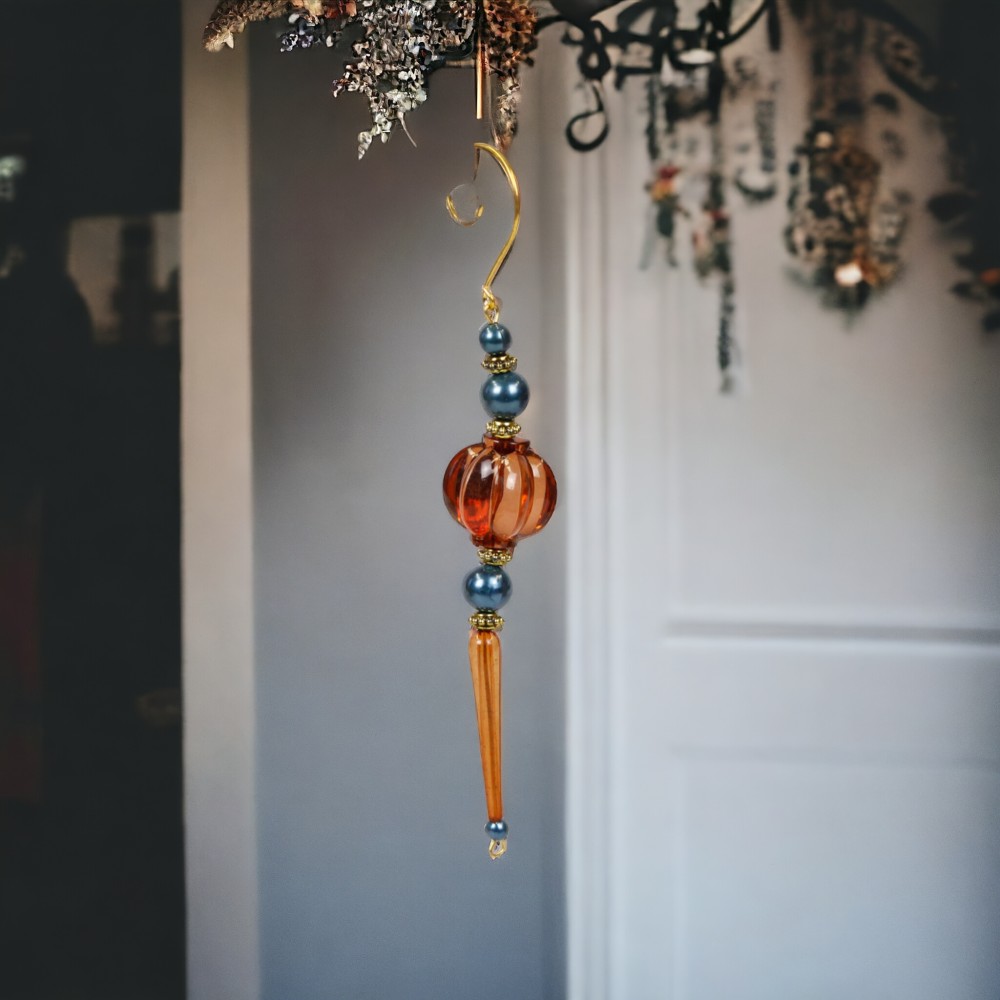 Metallilangassa roikkuva akryylihelmikoriste niin joulukuusen kuin korkean kynttilänjalankin.
