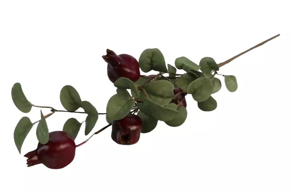 Näyttävä granaattiomenan oksa soveltuu yksittäin maljakkoon tai se on näyttävä lisä kuivakukka- tai kukka-asetelmaan. Oksassa on viisi näyttävää viininpunaista granaattiomenaa ja vihreät vahamaiset lehdet. Tämä oksa ei varmasti lakastu tai varise, vaan koristaa kotia vaikka ympäri vuoden.