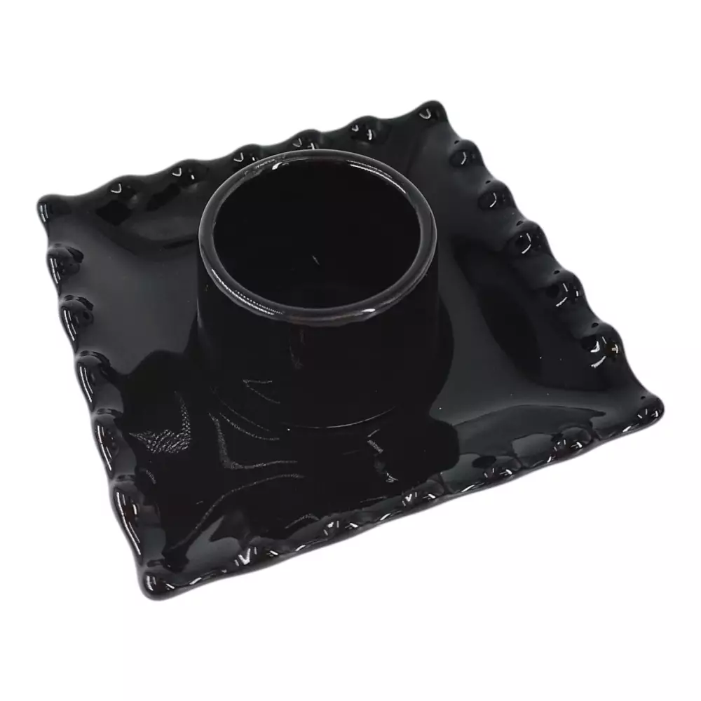 Keraaminen neliönmallinen musta kruunuputinjalka kruunuputille. Kruunuputinjalan reunassa helmimäinen pintakuviointi.