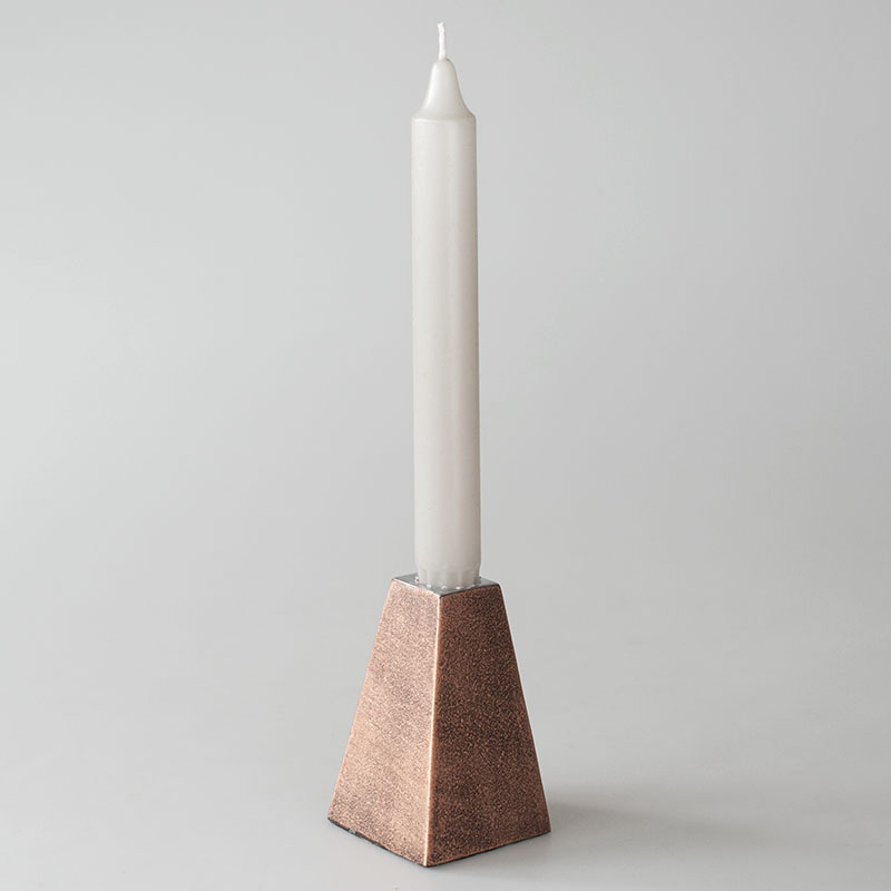 Pyramidin muotoinen kuparinen kynttilänjalka kruunukynttilälle.