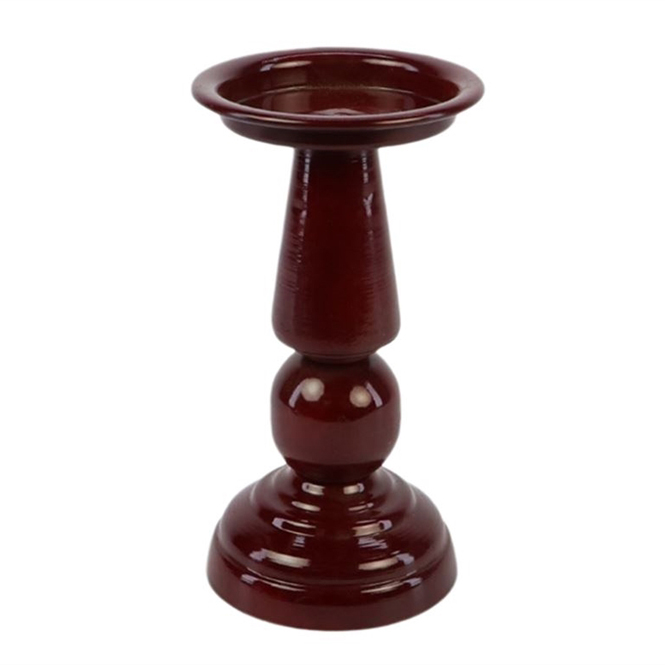 Koristeellinen viininpunainen kynttilänjalka soveltuu kauniisti sisustuksen väripilkuksi. Kynttilänjalan pinta on käsitelty paikoitellen tummaksi, kuin patinoituneen näköiseksi. Tukevasti paikallaan pysyvässä jalassa pöytäkynttilän polttaminen onnistuu turvallisesti.