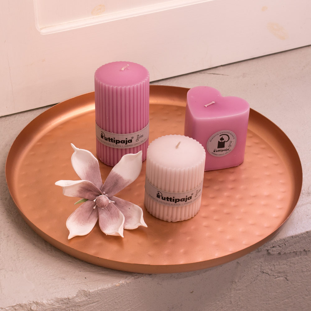 Vaaleanpunainen pintavärjätty sydänkynttilä 8 cm. Kynttilän paloaika 40 tuntia.