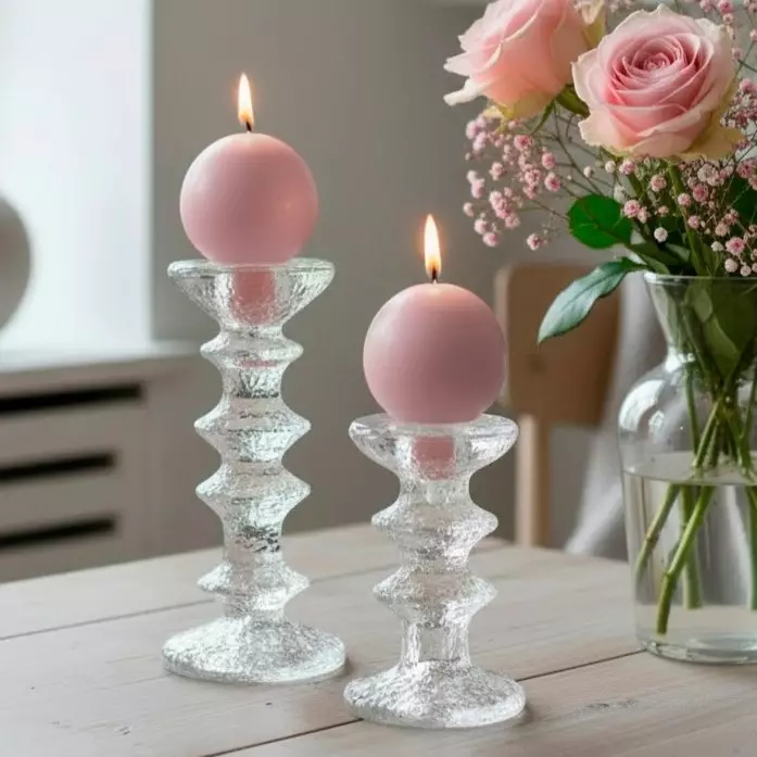 Vaaleanpunaisen jalallisen pallokynttilän paloaika on 12 tuntia. Pallokynttilät myydään kahden kynttilän paketissa.