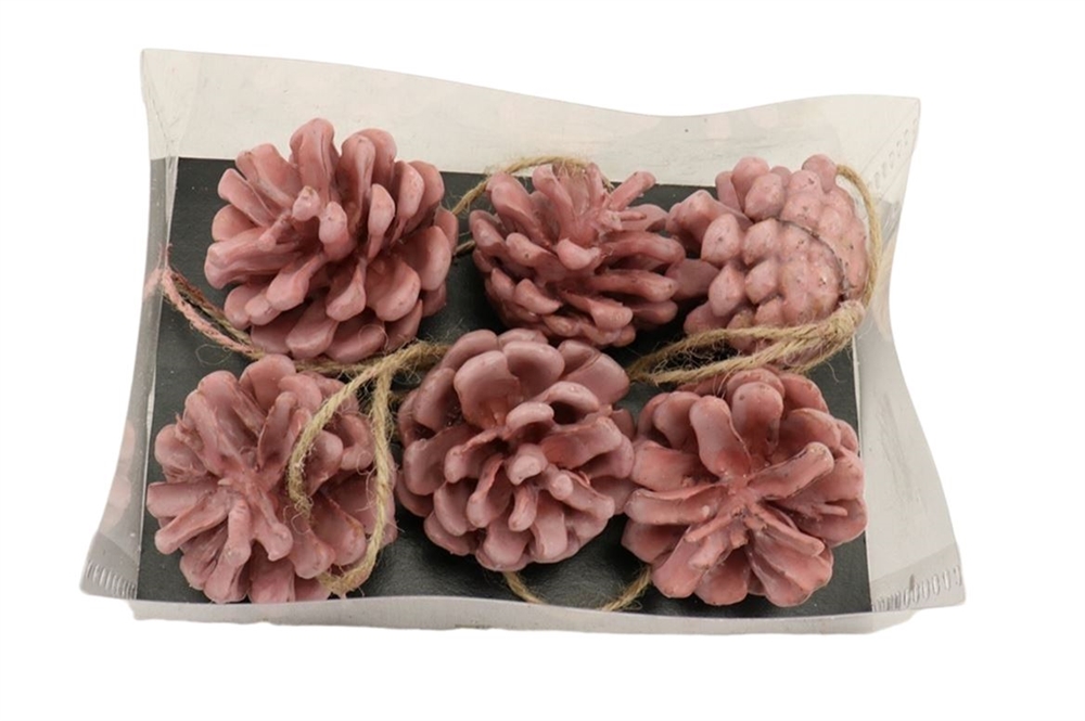 Hauska vaaleanpunainen käpykoriste kuuden kävyn pakkauksessa. Kävyt ovat näyttävä lisä kattaukseen, sisustuksen koristeeksi tai vaikka joulukuuseen roikkumaan. Kävyt ovat valmistettu kastamalla ne värilliseen vahaan. Kävyn yläosassa on kiinni juuttinaru, josta kävyn voi asettaa roikkumaan.