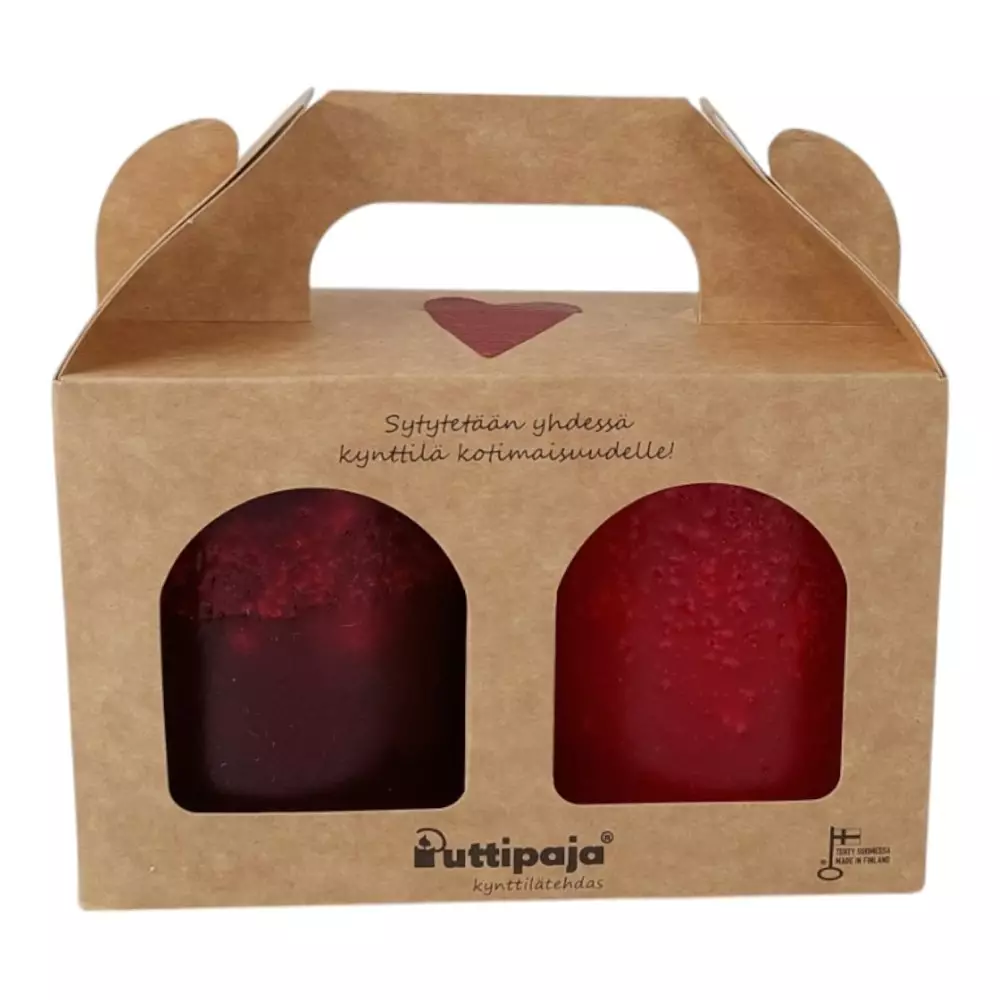 Kauniit läpivärjätyt joulukynttilät lahjapakkauksessa. Salkkua koristaa punainen sydätarra. Salkku on valmistettu Suomessa kierrätettävästä kartongista.