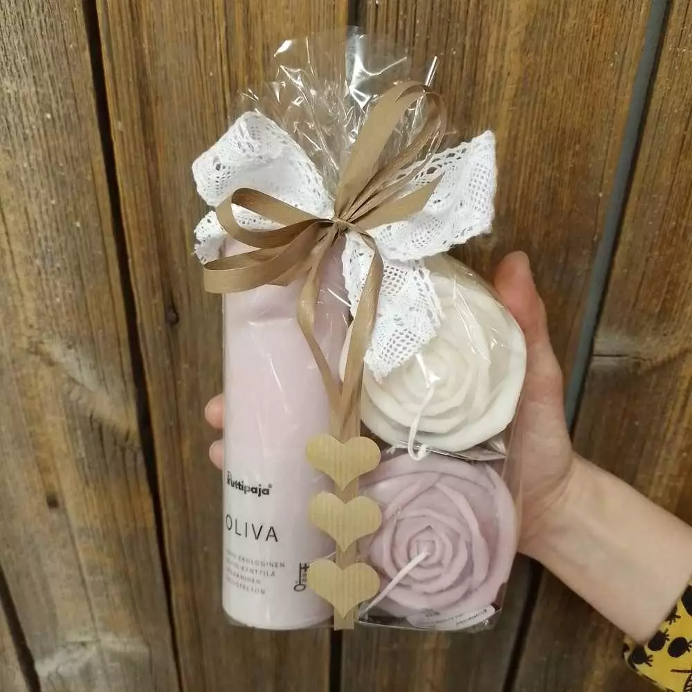 Kaunis lahjapakkaus, joka sisältää ekologisen ja vegaanisen OLIVAvaha pöytäkynttilän sekä kaksi ruusukynttilää