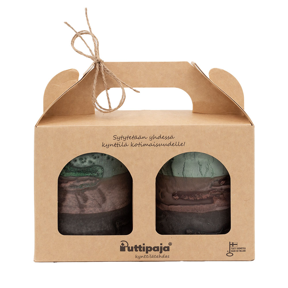Lahjapakkaus sisältää kaksi tervantuoksuista kynttilää