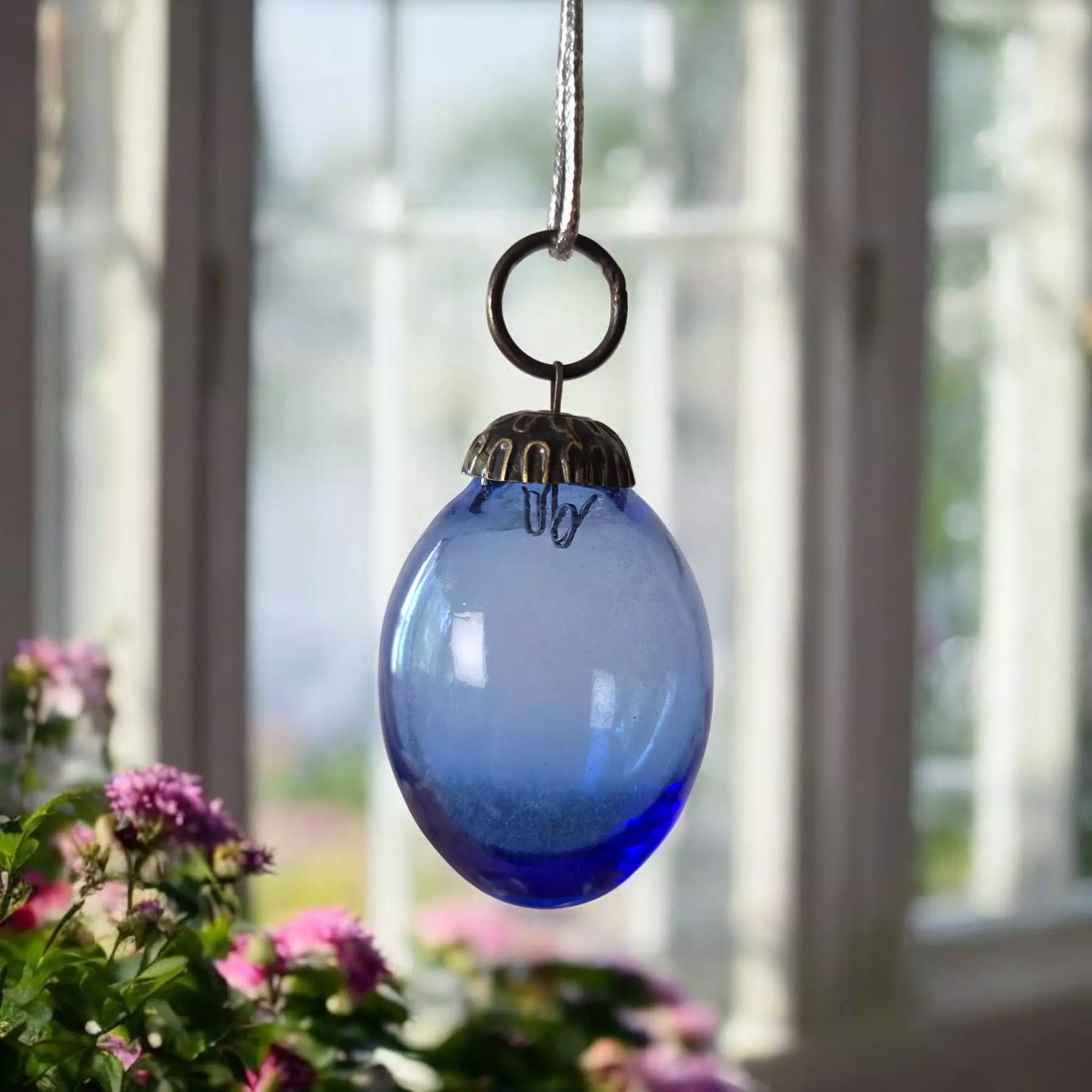 Tämä kaunis koristemuna on valmistettu paksusta lasista ja metallisesta ripustuslenkistä.