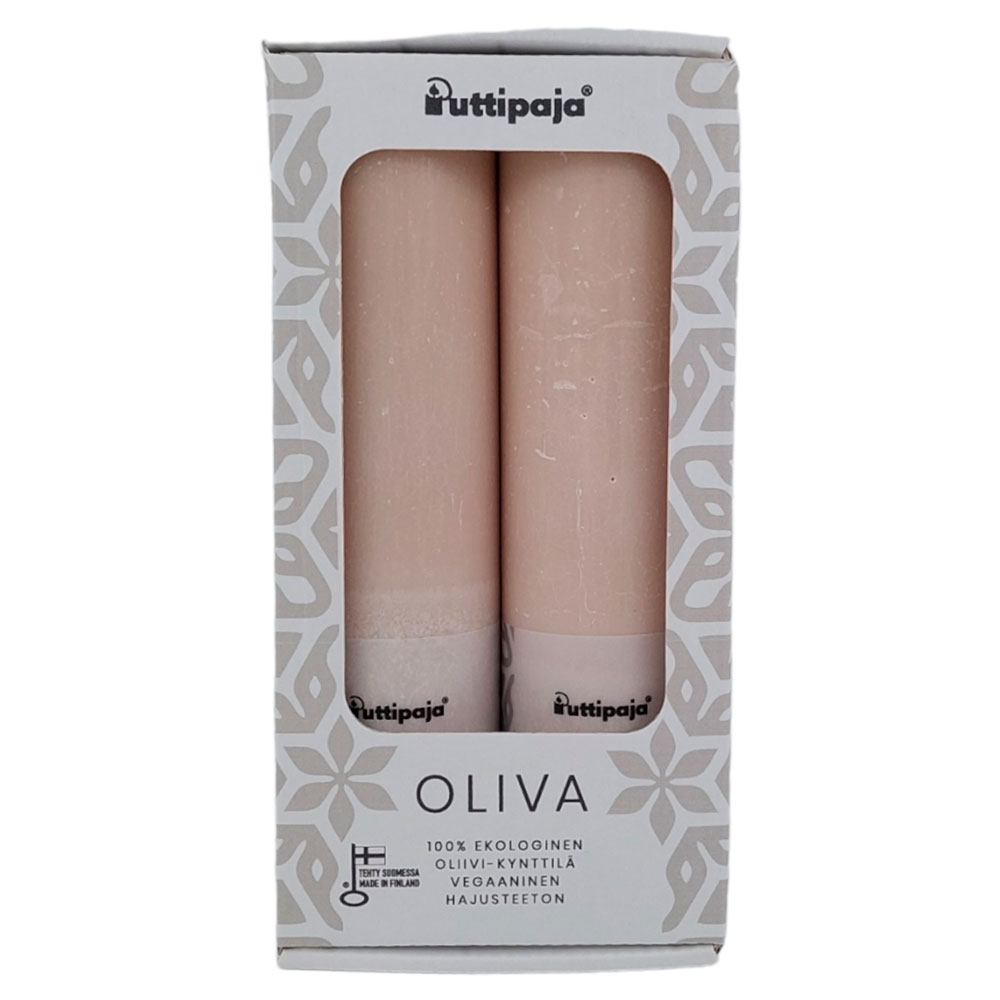 Pakkaus sisältää kaksi Oliva-kynttilää, kynttilöiden korkeus 20 cm. Lahjapakkaus on kierrätettävää kartonkia.