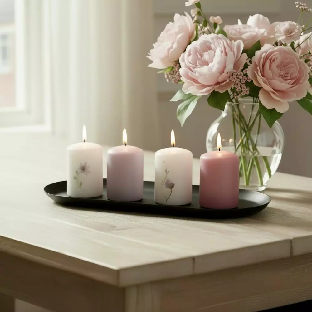 Pöytäkynttiläpakkaus 4 kpl – Hento kukkateema (roosa & laventeli)