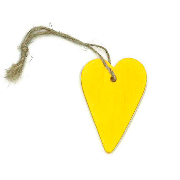 Keltainen puusydän juuttinarulla. Sydämen korkeus 5,5 cm. Myyntierä 20 kpl.