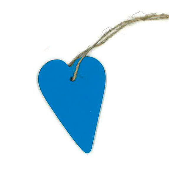 Taivaansininen puusydän juuttinarulla. Sydämen korkeus 5,5 cm. Myyntierä 20 kpl.