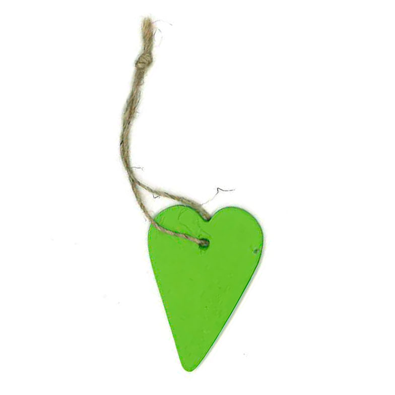 Vihreä puusydän juuttinarulla. Sydämen korkeus 5,5 cm.