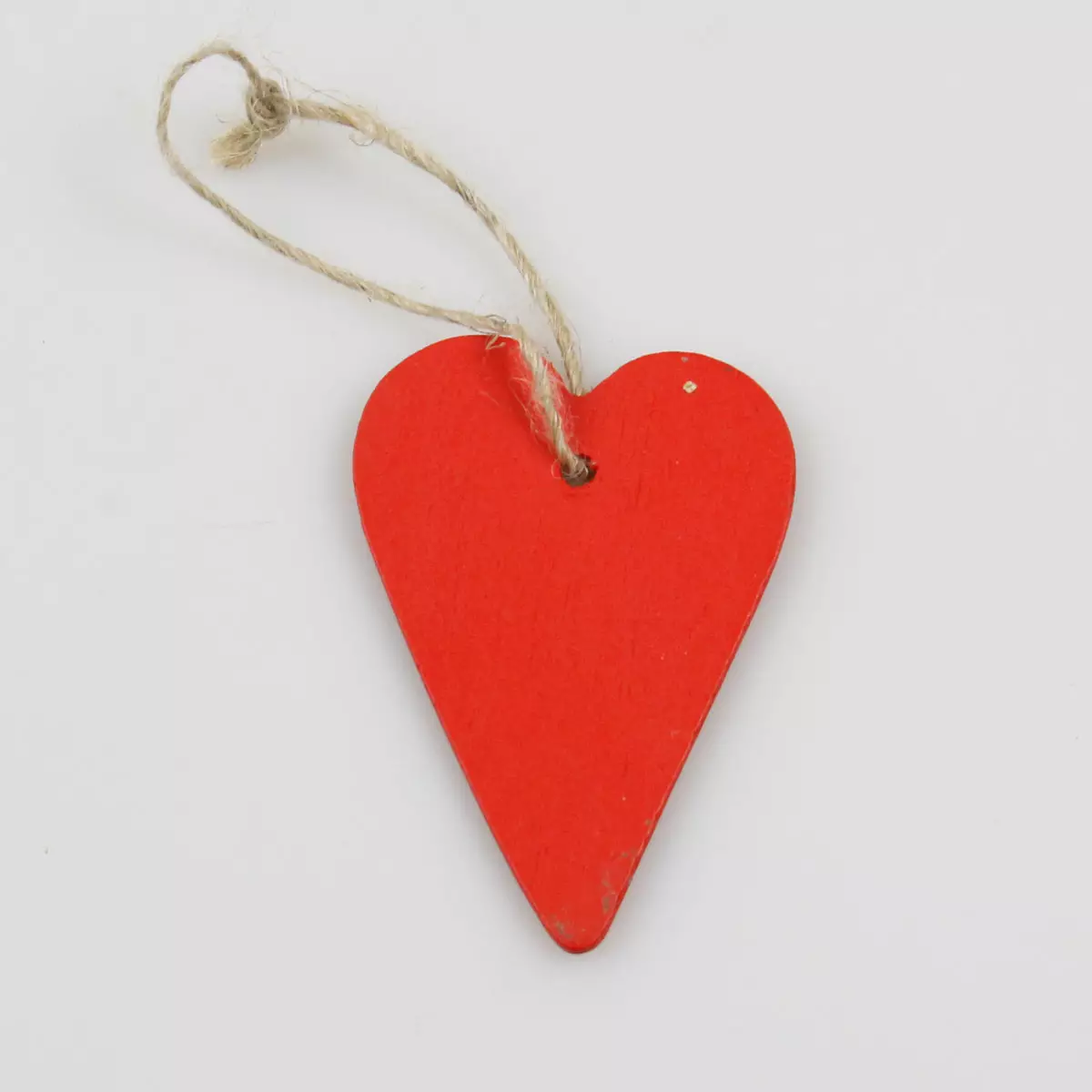 Punainen puusydän juuttinarulla. Sydämen korkeus 5,5 cm. Myyntierä 20 kpl.