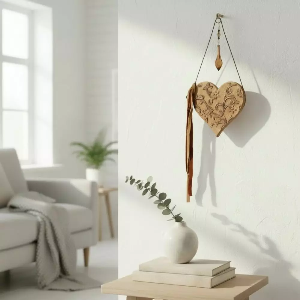 Rustiikkisesta sydämessä on kaunis ornamenttikuviointi ja siitä roikkuu koristeena huopanauhoja ja akryylikristalli.