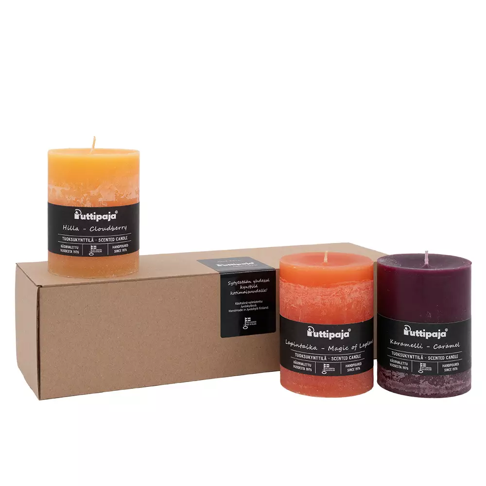 Paketin sisältämät tuoksukynttilät ovat Hilla, Lapintaika ja Karamelli
