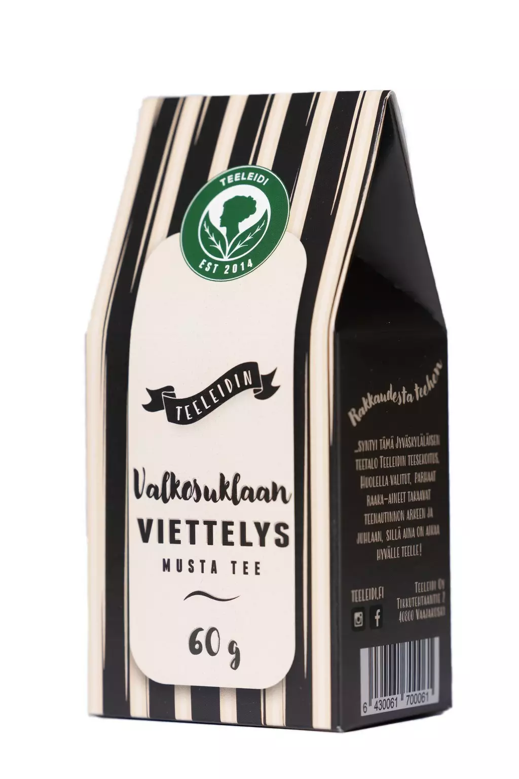Aromikkaan mustan teen ja hienostuneen valkosuklaan yhdistelmä hellii aisteja ja tuo ylellisyyttä niin arkeen kuin juhlaan. Pakattu Vaajakosken vanhalla tulitikkutehtaalla, jossa Teeleidin teet pakataan ja viimeistellään.