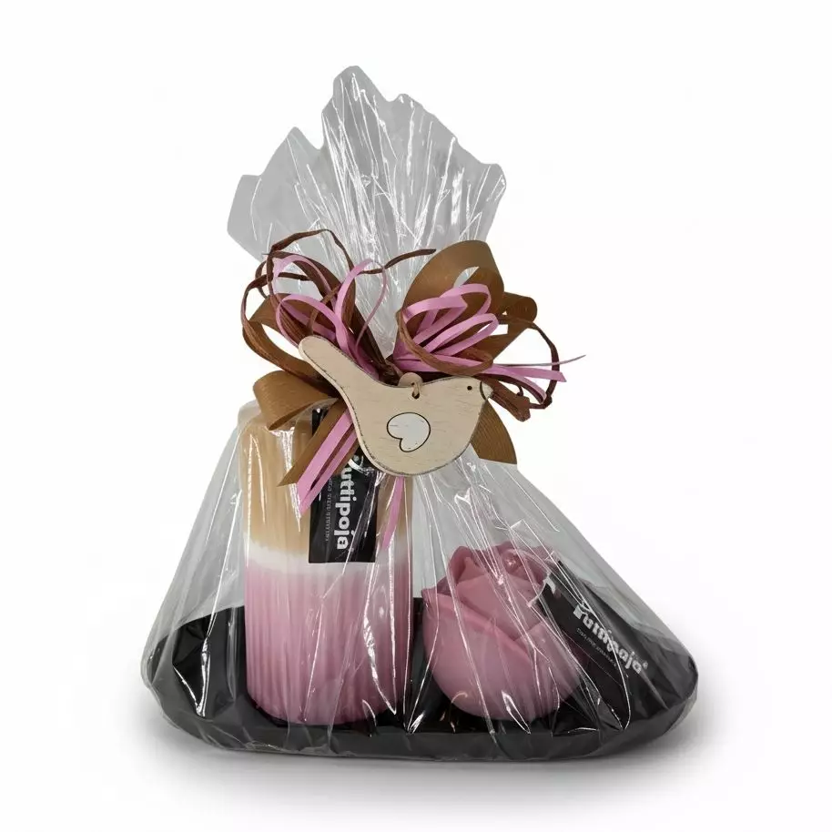 Ihastuttava lahja valmiiksi paketoituna - kuinka kätevää! Kynttilälahja on pakattu sellofaaniin ja se on viimeistelty kauniilla nauhoilla.