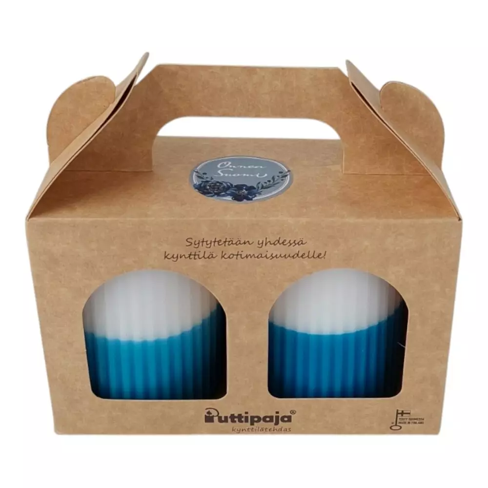 Kauniisti paketoituna kaksi sinivalkoista vekkikynttilää.