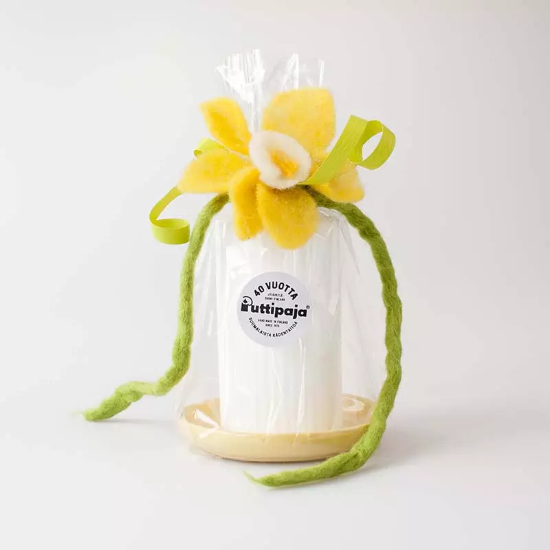 Kaunis keväinen lahjapaketti sisältää vekkikynttilän, alusen ja huopakukan.