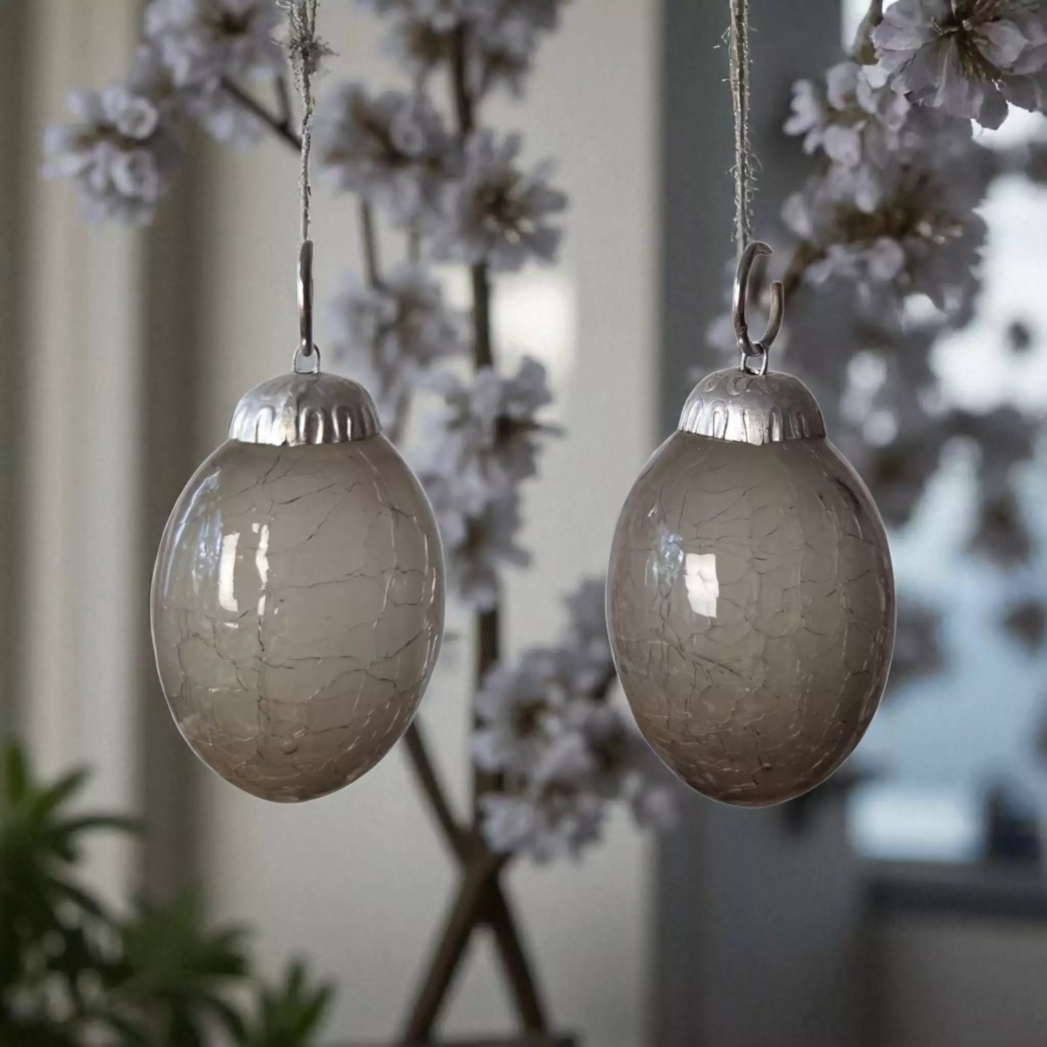 Tämä kaunis koristemuna on valmistettu paksusta lasista ja metallisesta ripustuslenkistä.