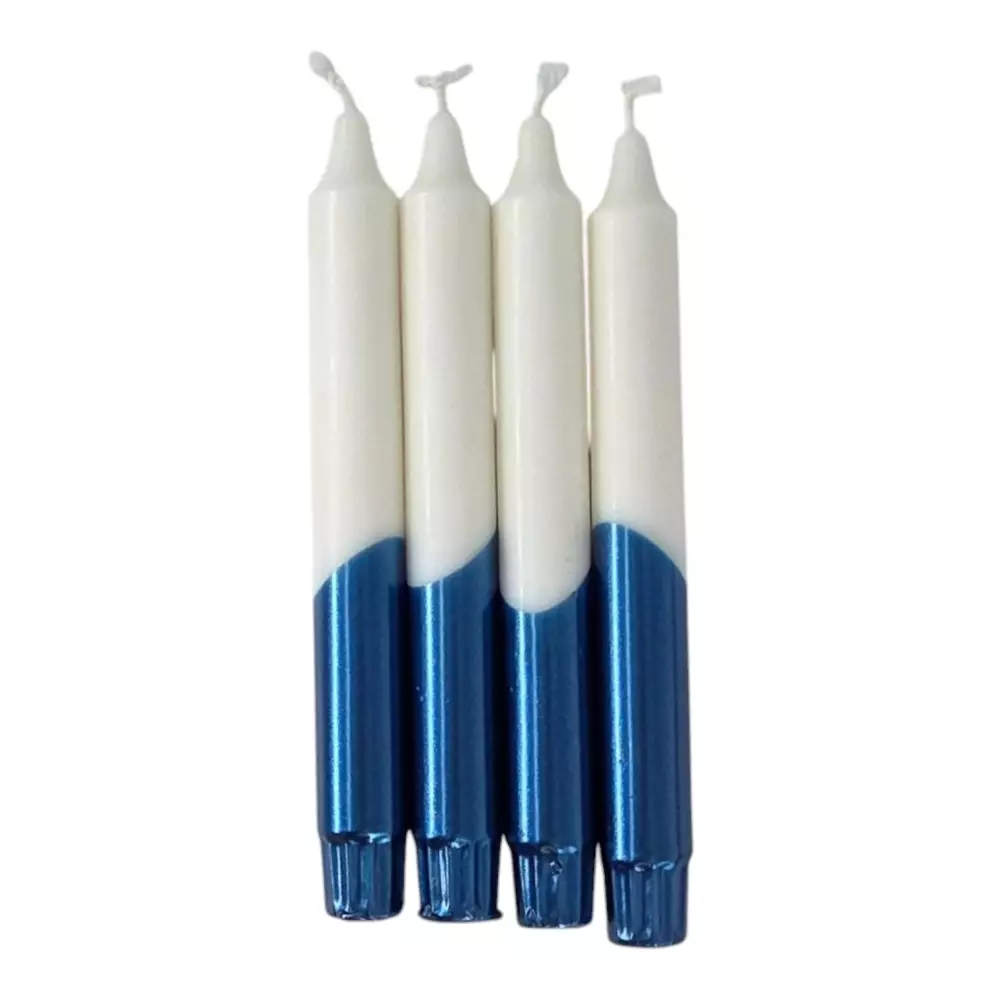 Lajitelma metallihohtoiseen lipunsiniseen osittain kasteltuja kruunukynttilöitä sopii hyvin itsenäisyyspäivän juhlintaan.