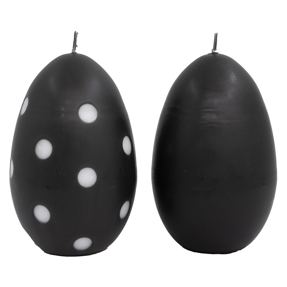 Munakynttilä, pilkullinen tai yksivärinen Väri: Musta Koostumus: 100% parafiinia Koko: Kynttilän halkaisija 8 cm. Kynttilän korkeus 13 cm. Kynttilän paloaika: ~40 h