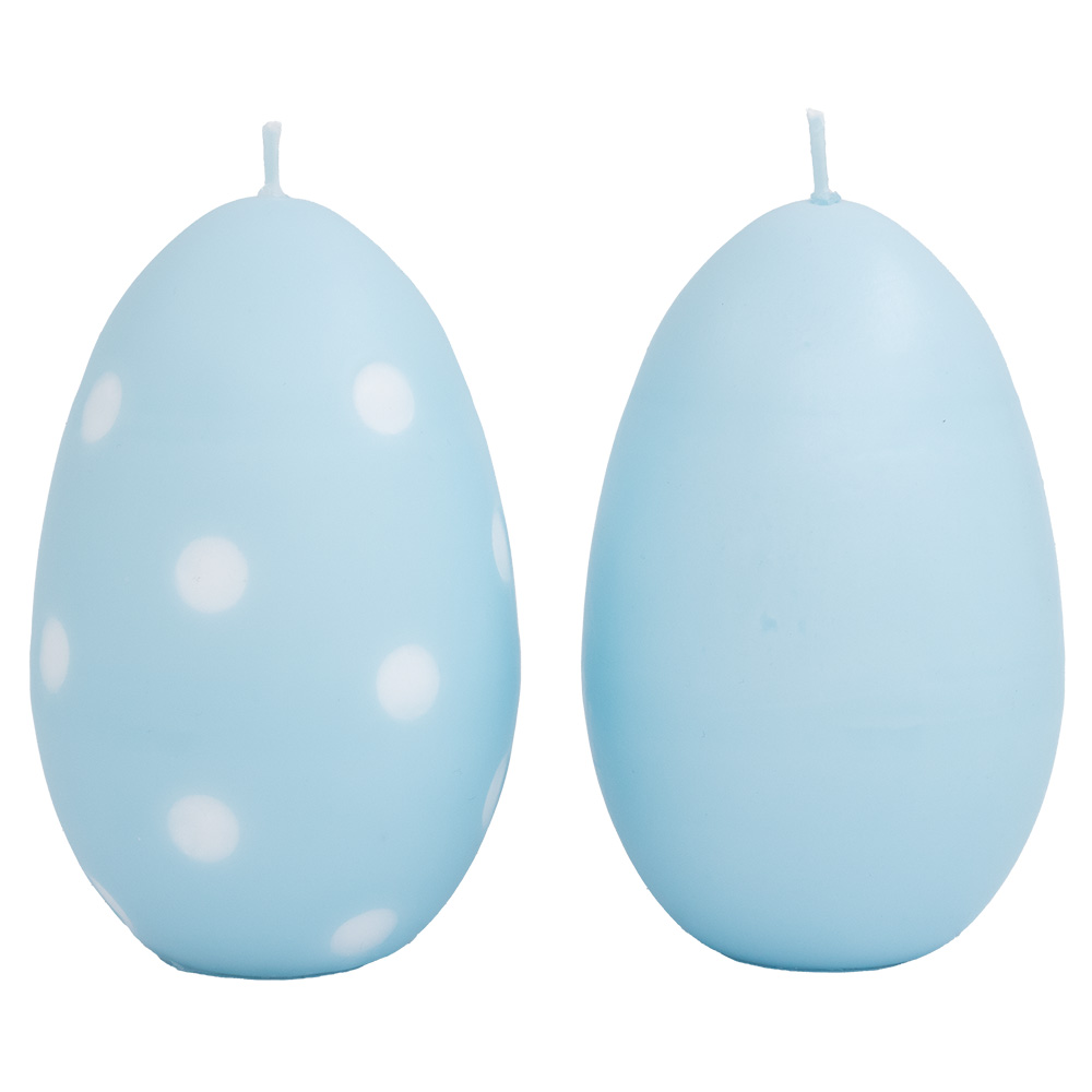 Munakynttilä, pilkullinen tai yksivärinen Väri: Vaaleansininen Koostumus: 100% parafiinia Koko: Kynttilän halkaisija 8 cm. Kynttilän korkeus 13 cm. Kynttilän paloaika: ~40 h