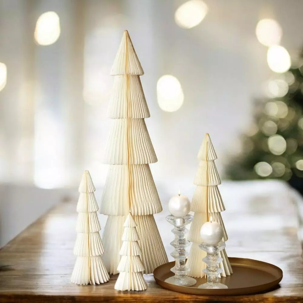 Tämä näyttävän kokoinen paperikuusi on viimeistelty henkäyksellä kultahilettä ja se on ajaton ja ekologinen koriste erilaisiin talven ja joulun asetelmiin.